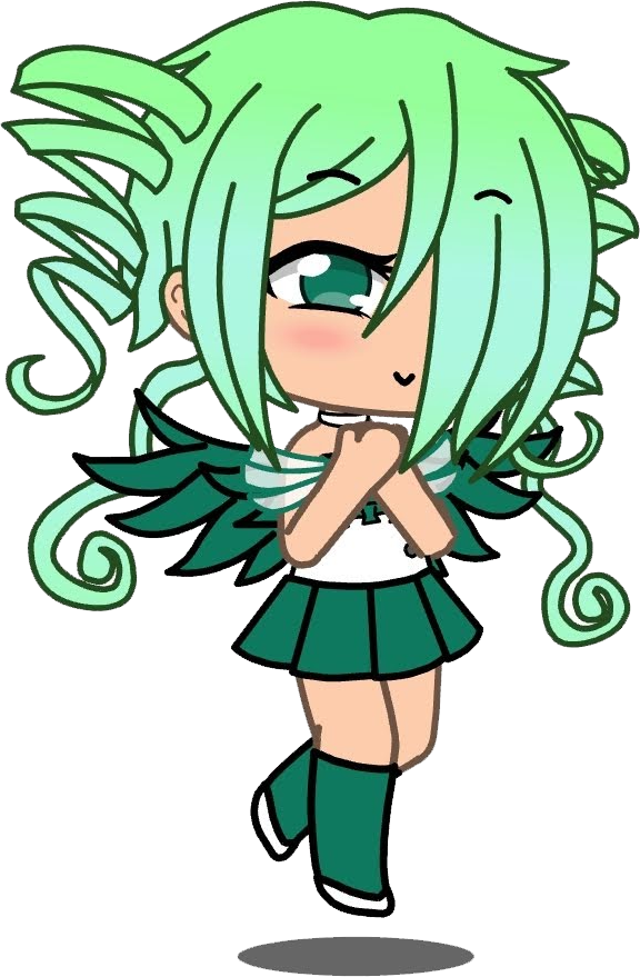 Pixie has lime green hair fading into a minty color, with short twin drills, lower hair twisted into two curly ropes of hair, and her bangs covering one of her dark green eyes. On top of her lightly tanned skin is her attire: a white top with dark green accents; a dark green skirt; knee-length dark green socks; and white shoes. She also has a pair of feathery wings in dark green.