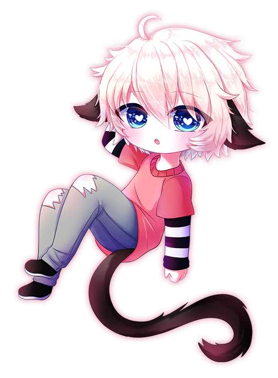 Radd has white hair that fades into a light pink color he also has a black ear on his hair, and a black tail. He has blue eyes. His outfit is red and black themed his jeans are ripped and has long sleeves.