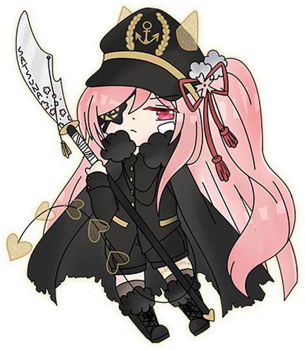 Satsuna is a fair-skinned girl who has long pink hair, some of it tied into a ponytail. She has big cherry pink eyes, one of which is covered by a flower-shaped eye patch with a yellow rose on it. There is also a white band-aid placed over the side of her jawbone.